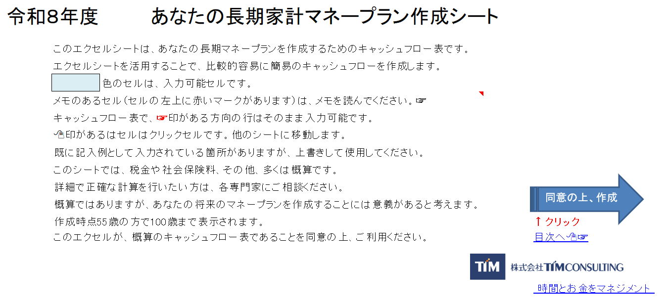 キャッシュフロー表 TIM1の作成方法を説明しました。出来るだけ自動入力できるようにはしてあります。全ての人に対応できているとは、とても言えませんが、ザックリと長期に渡るお金の動きを掴みたいという方には適している思います。ここでは、別のシートに遷移してからの入力の方法は説明できませんでした。その説明については、別のページで展開していきたいと思います。最後まで、お付き合い頂きまして、ありがとうございました。さあ、時間を味方にしましょう!